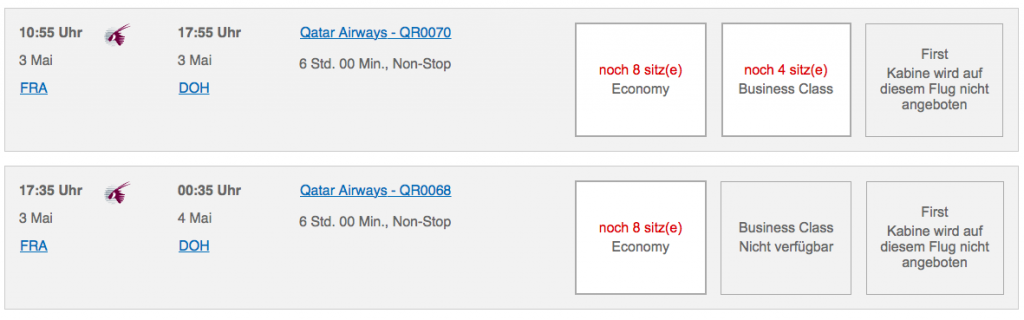 Ein kleiner Wermutstropfen bleibt allerdings, denn Qatar weiß natürlich um die Beliebtheit der QSuite. Aktuell ist die besonders günstige Business Class Buchungsklasse R, in welche alle Angebote mit der Qatar Airways Business Class buchen, leider auf fast keinem Flug mit QSuite aus Frankfurt verfügbar. Wer allerdings Flugtickets zum regulären Preis bucht, kann die Qatar Airways QSuite bereits jetzt direkt bei Qatar ab Frankfurt buchen.