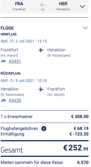 Mit der Verdoppelung der Meilen würden wir bei der Strecke von Frankfurt-Heraklion (Kreta) insgesamt 13.140 Meilen generieren! Ein absolut großartiger Mehrwert. Aegean bietet ein gutes Produkt an Bord, in der Business Class gibt es wieder einen vollständigen Service mit warmen Hauptgängen, mehreren Weinen und Kaffeespezialitäten. Die Tickets sind flexibel und stornierbar, hinzu kommen freie Sitzplatzreservierung, erhöhtes Freigepäck und Loungezugang.