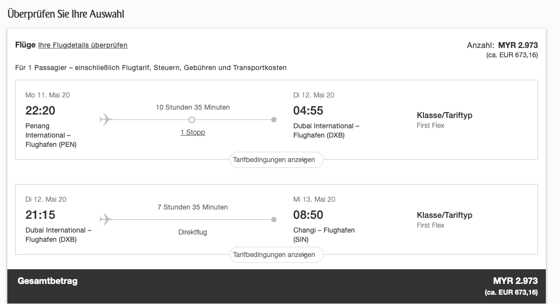 Wenn man den 1,5 Stunden Flug von Penang in Malaysia nach Singapur in der First Class alleine bucht, berechnet Emirates etwa 400 Euro für ein First Class Ticket, was an sich schon nicht unbezahlbar ist, für das „Erlebnis Emirates FIRST Class“. Gerade erlaubt Emirates aber auch Routings von Penang über Dubai nach Singapur.