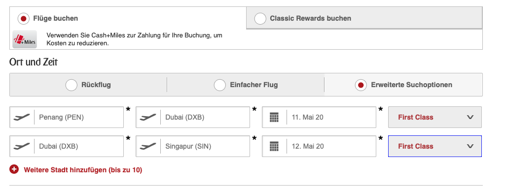 Die Buchung dieses Emirates FIRST Class Error Fares (oder Sonderangebotes?) ist eigentlich sehr einfach und lässt sich direkt über die Emirates Webseite erledigen. Wichtig ist aber, dass Ihr über die „erweiterte Suche“ geht und hier eine Multi- Stop Verbindung wählt.