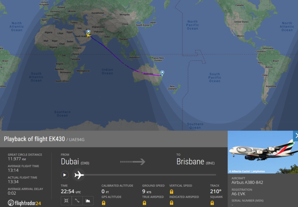 Der Airbus A380-800 war am Freitag, 1. Juli 2022 mit der Flugnummer EK430 von Dubai (DXB) nach Brisbane (BNE) geplant. Etwa 13 1/2 Stunden dauert die Reise von den Vereinigten Arabischen Emiraten nach Australien. Und so verliefen die über 13 Stunden für die meisten Passagiere auch ohne besondere Vorkommnisse. Nur einzelne berichteten, wie das Portal aviationherald.com in einer Meldung bekannt gab, dass es bereits 30-45 Minuten nach dem Start in Dubai zu einem Knall kam.