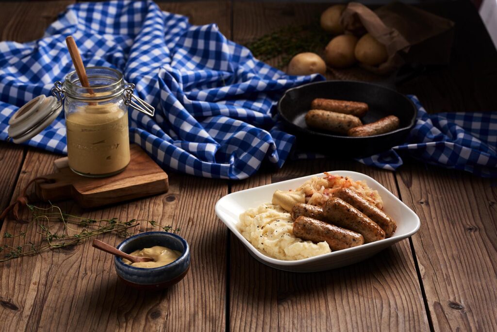 In der Economy Class können Passagiere Leberkäse aus Huhn- und Rindfleisch, an Kartoffelbrei und Sauerkraut bekommen. Zum Dessert serviert Emirates ein Stück Bienenstich.