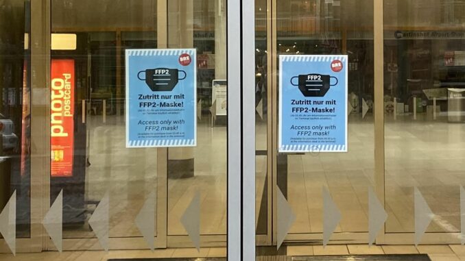 Im Terminal empfiehlt der Flughafenbetreiber freiwillig eine Maske zu tragen. Im Gegensatz zu Frankfurt ist das Tragen einer Maske in den Bussen und im Peoplemover jedoch Pflicht.