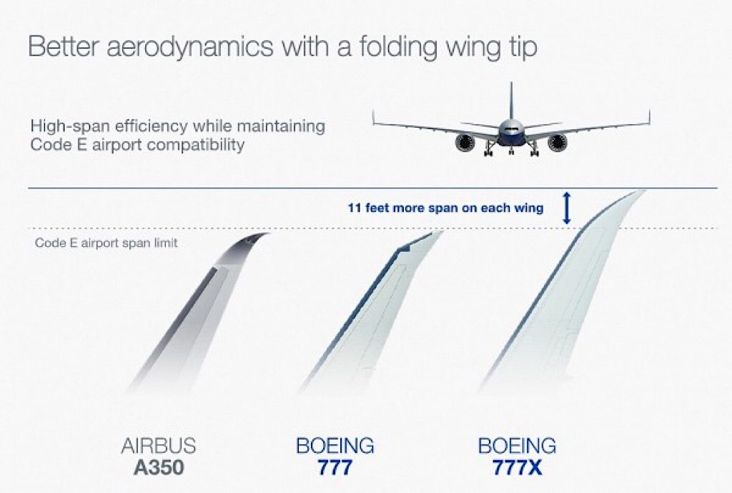 Laien erkennen die B777X wahrscheinlich nur als normales Flugzeug wieder. Es ist weder ein Doppelstöcker, noch hat sie den markanten Buckel vom Jumbo. Sie kommt auch mit nur zwei Triebwerken aus, wird aber wesentlich größer als die bisherige 777 sein. Durch die größere Kapazität wurden auch neue Tragflächen notwendig, die einklappbar sein werden und somit etwas Charakteristisches mitbringen.
