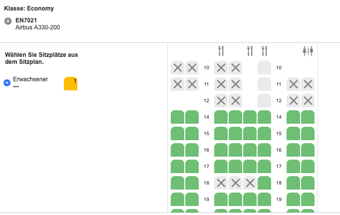 Die Airbus A330-200 Jets von Eurowings verfügen mit der BEST Class auch über eine Premium Economy Class, welche auf dieser Strecke aktuell nicht gesondert verkauft wird. In der Seat Map sind die Sitze mit einer bequemeren 2-3-2 Bestuhlung auch als Economy Class Sitze ausgewiesen, allerdings kann man sie aktuell nicht reservieren und auch für Statuskunden mit SEN/HON Status sind diese aktuell noch geblockt.