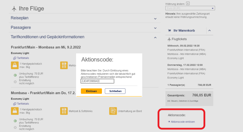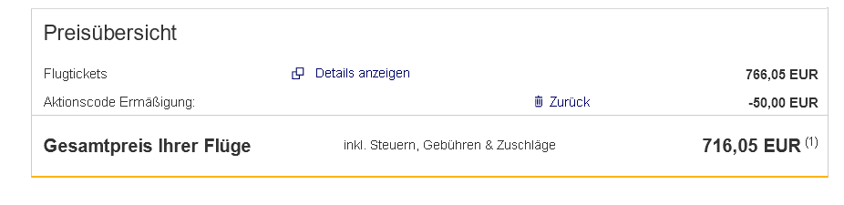 Wenn Ihr Eure Bezahldaten bei der Buchung auf Lufthansa.com eingebt, könnt Ihr auch Euren 50 Euro Eurowings Discover Gutscheincode anwenden. Der Flugpreis wird automatisch reduziert. Achtet bitte darauf, dass die 50 Euro Rabatt nur auf den Flugpreis und nicht auf die Steuern und Gebühren gelten.