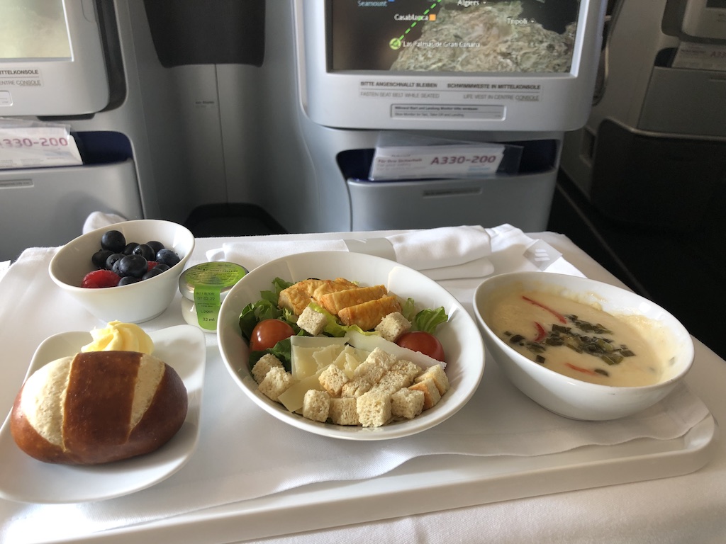 Auf Mittelstrecken wie z.B. auf die Kanarischen Inseln oder nach Nordafrika gibt es vor der Landung in der Business Class noch einen salzigen Snack. Getränke sind jederzeit verfügbar, Kissen und Dicken erhalten Gäste auf Anfrage und so lange der Vorrat reicht.