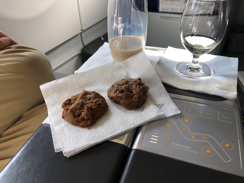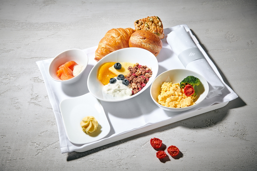 Das Geschirr ist aus Porzellan, künftig kommen auch Metallbesteck und Stoffservietten zum Einsatz. Die Flugbegleiter reichen dazu Gebäck aus dem Brotkorb und servieren Getränke. Das Sortiment beinhaltet Softdrinks, jeweils einen Rot- und Weißwein, Bier und Sekt. Auch Spirituosen sind im Angebot, darunter Markengetränke wie Elephant Gin. Anschließend werden noch warme Schokokekse und Heißgetränke serviert. Diese Kekse gibt es auf den Langstreckenflügen sogar in der Economy Class.