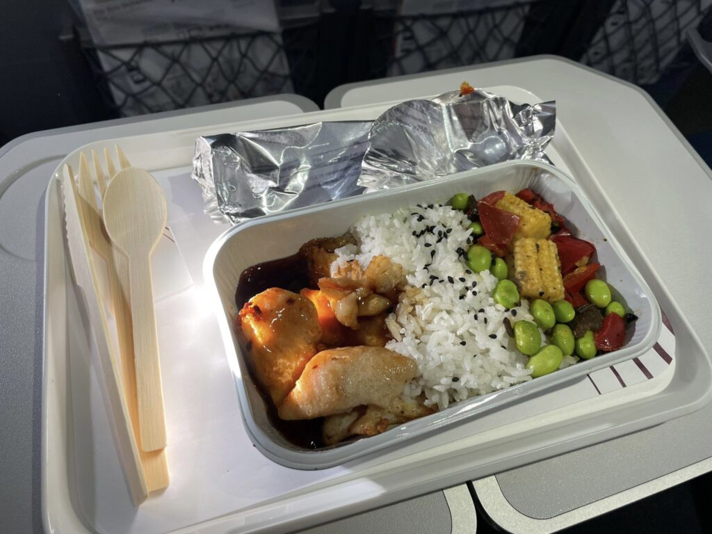 Bei einem 8-Stunden Flug wären zwei warme Mahlzeiten in Economy schon etwas hoch gegriffen. Frage mich ob man das überhaupt in Business bekommt…