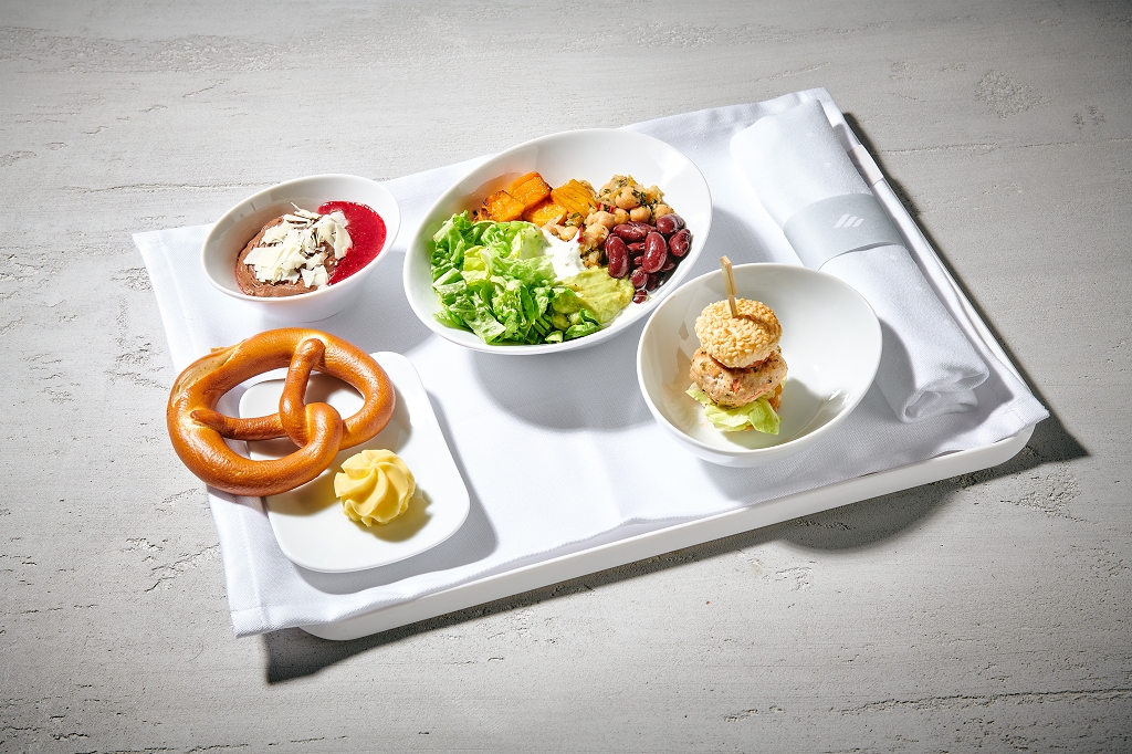 Nach dem Start erhalten die Gäste ein mittelgroßes Tablett mit mehreren Komponenten. In Realität ist dies etwas kleiner als auf den Abbildungen, ein Brotteller wie auf Langstrecken entfällt. Auf dem Tray befindet sich eine zur Tageszeit passende kalte Mahlzeit sowie eine Schale mit einem warmen Snack. Bei einem Abflug vor 10 Uhr morgens wird Frühstück serviert, danach wechselnde Gerichte wie ein Tapas-Teller bei Start in Deutschland oder Mini-Burger auf dem Rückflug.