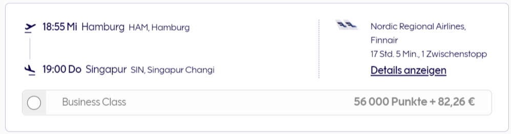 .Die Anzahl der Finnair Plus Punkte, die Ihr für Award-Tickets benötigt, hängt von der Strecke ab. Bei interkontinentalen Flügen ist der Zubringer nach Helsinki auch immer inkludiert. Wenn Ihr also von Hamburg über Helsinki nach Singapur fliegt, benötigt Ihr genauso viele Meilen/Punkte, wie bei einer Buchung des Fluges von Helsinki nach Singapur allein. Lediglich die Steuern und Gebühren erhöhen sich dann etwas, sind bei Finnair im Vergleich zu Lufthansa oder British Airways immer noch mehr als fair.