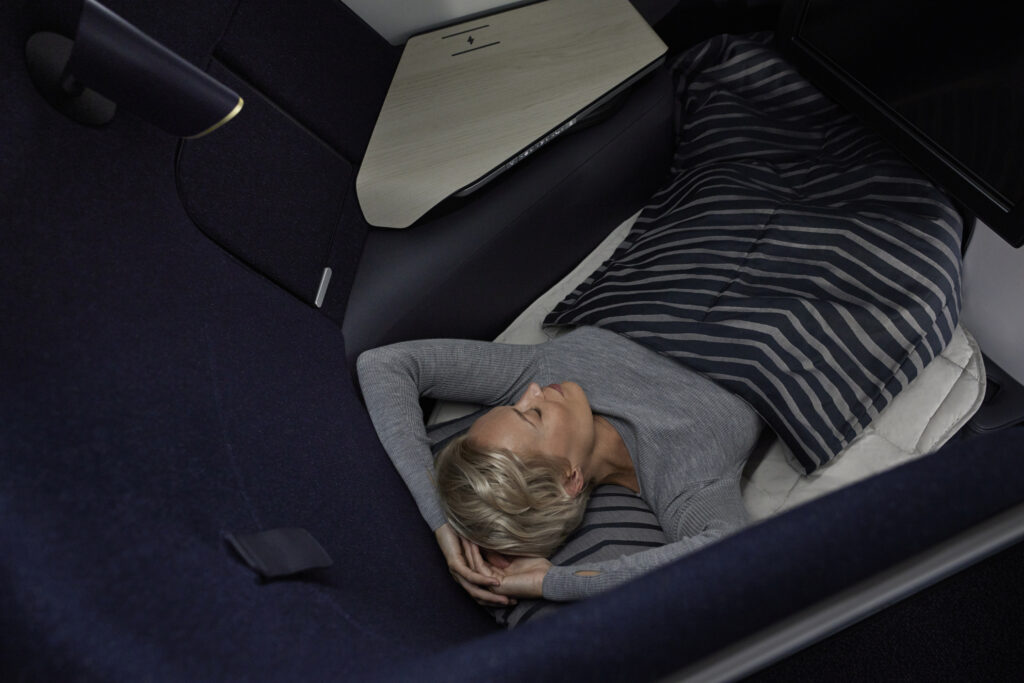 Zu einem vollkommen flachen Bett kann man den neuen Finnair Business Class Sitz dennoch umbauen. Hierbei wird eine Stütze heraus geklappt und die so entstehende Liegefläche mit einer Matratzenauflage belegt.