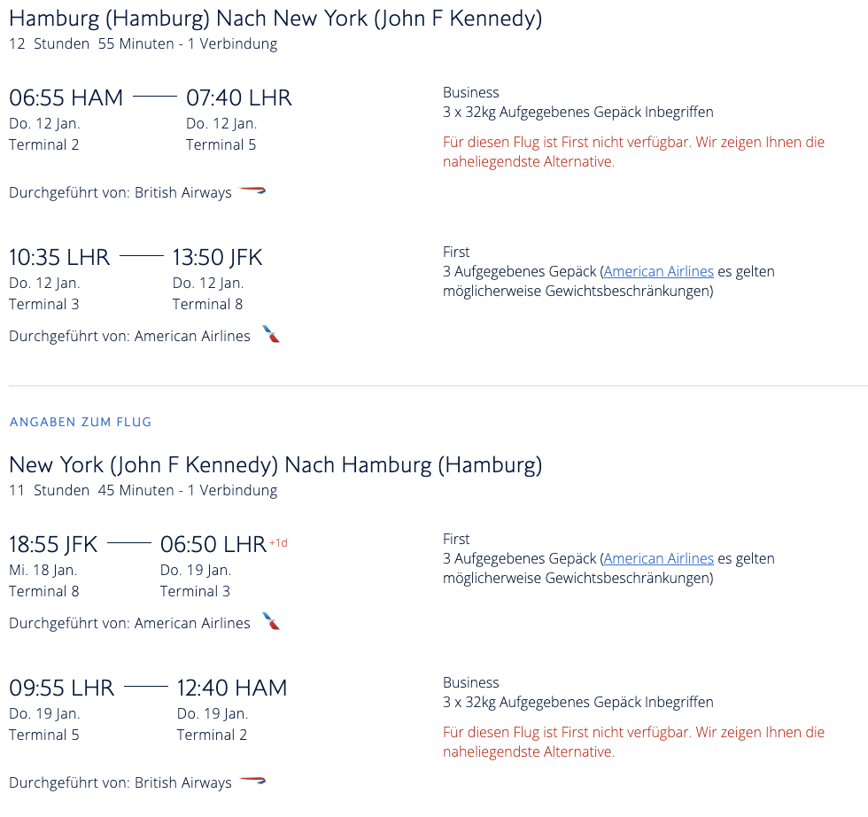 - Buchungsklasse: First Class A, Business Class Zubringer J