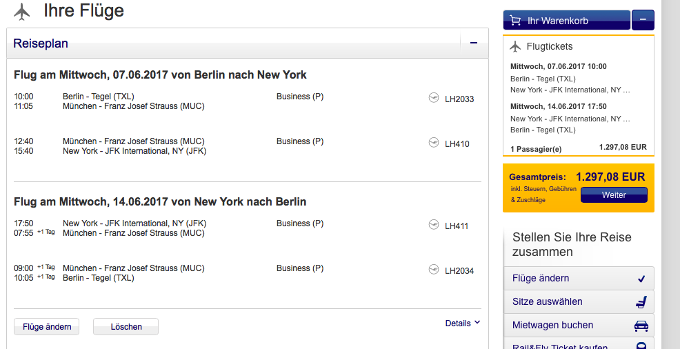 Die meisten Optionen habe ich auf Expedia gefunden, allerdings lässt sich der Tarif auch für wenige Euro mehr direkt bei Lufthansa mit sehr guter Verfügbarkeit buchen.