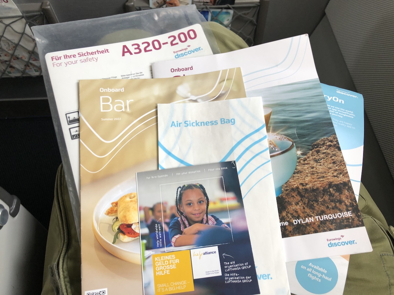 Der Purser stellte sich vor und erwähnte sogar alle Namen seiner Kollegen, dann wurden meine Getränkewünsche abgefragt. Er nahm sich viel Zeit, verbreitete gute Laune und hatte sichtlich Spass an seiner Arbeit. Speisekarten mit den Infos über das Sortiment gab es leider nicht, eine gewisse Übersicht findet man aber in der Bordbar-Menükarte in der Sitztasche. Die Tasche ist auch sonst gut gefüllt, bei Discover findet man dort neben der Sicherheitskarte auch einen Shop-Katalog und Werbematerial, ein Bordmagazin existiert aber nicht.