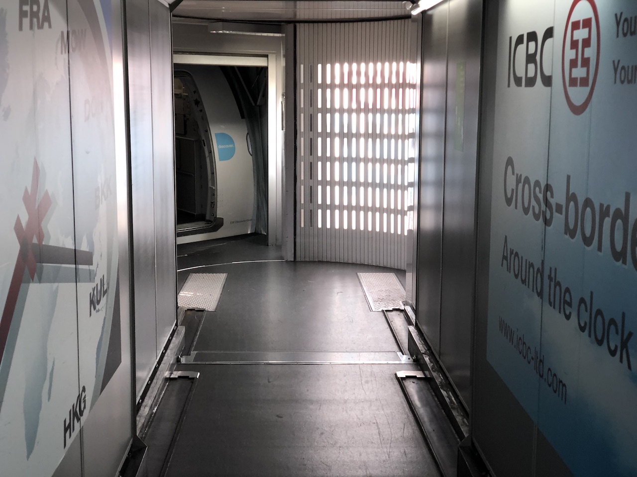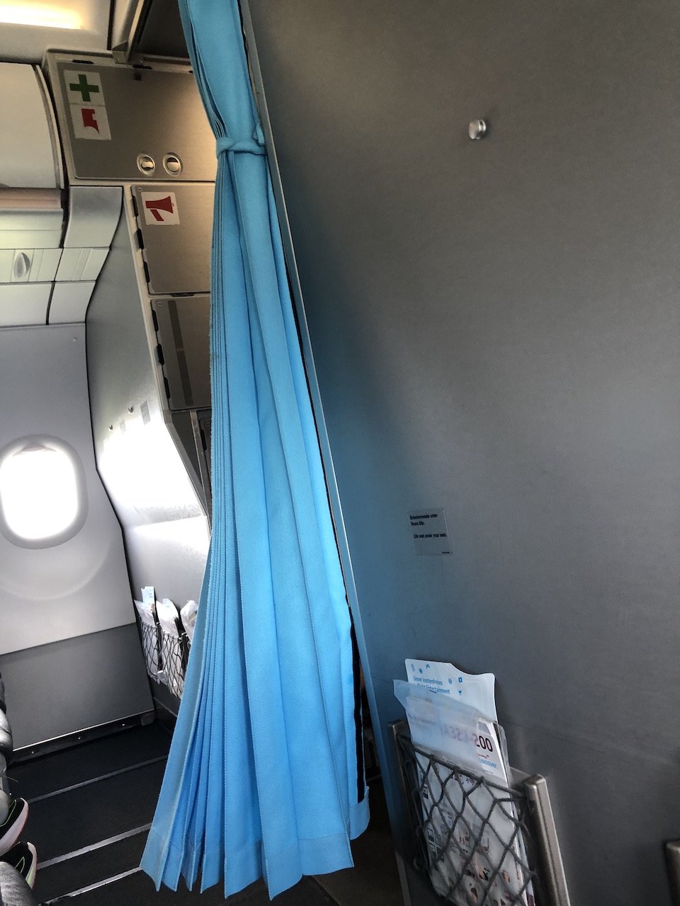 Die Crew begrüßte uns mit Desinfektionstüchern, die Business Class füllte sich zuerst. Vier Reihen waren mit einem Vorhang von der Economy Class abgetrennt, etwa zehn Passagiere haben sich heute für die Plätze in der vorderen Klasse entschieden.