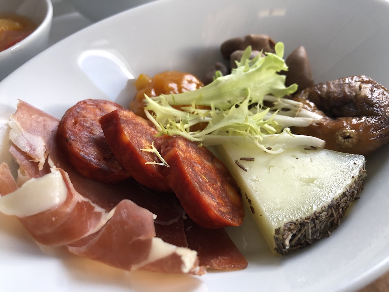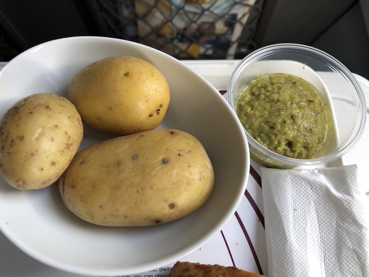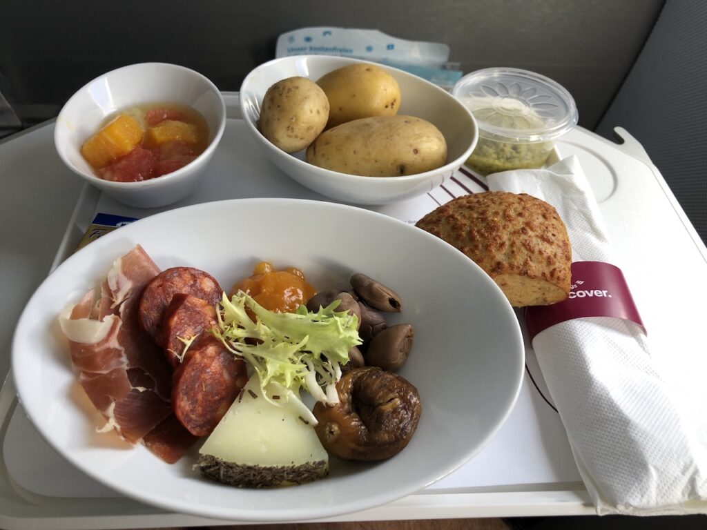 Als ich vom Waschraum zurück zum Sitzplatz kehrte war das Essen auf einem Tablett bereits am Platz. Darauf Tapas und warme Kartoffeln mit Mojo sowie Früchten. Die Aluminiumschale mit Einwegbesteck, die es zu den Anfangszeiten gab, ist also tatsächlich verschwunden, die Aufmachung ist nun deutlich hochwertiger.