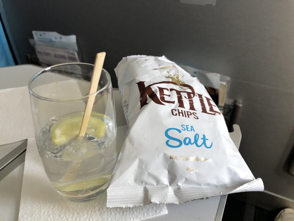 Bei der Gelegenheit habe ich mich dann auch für einen G&T entschieden, der Wunsch nach einer Knabberei wurde mit Chips aus der Economy-Bordbar beantwortet- eine wirklich nette Geste. Aus dem Fenster konnte ich den schönen Landeanflug beobachten, kurze Zeit später erreichten wir den direkt am Meer gelegenen Airport.