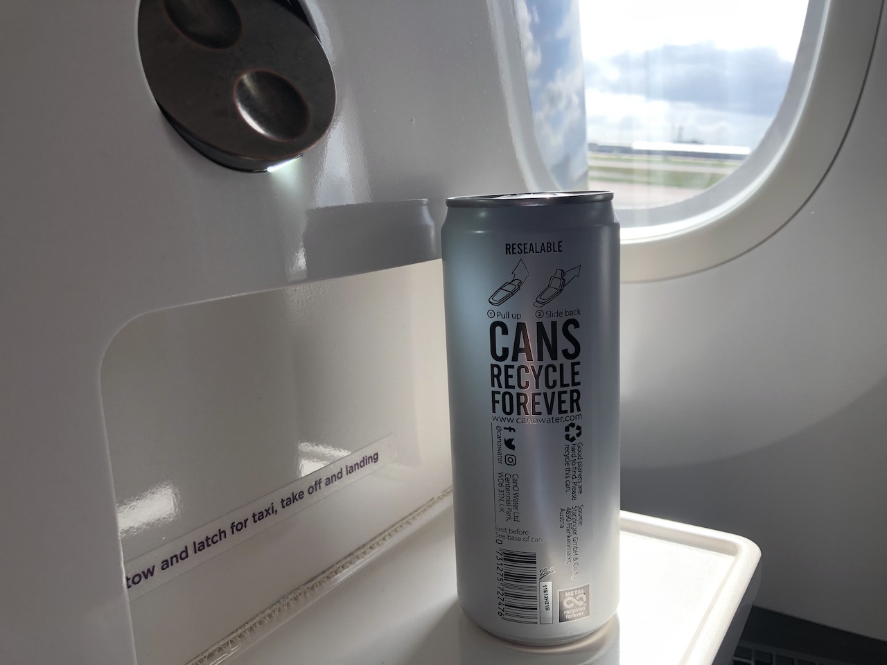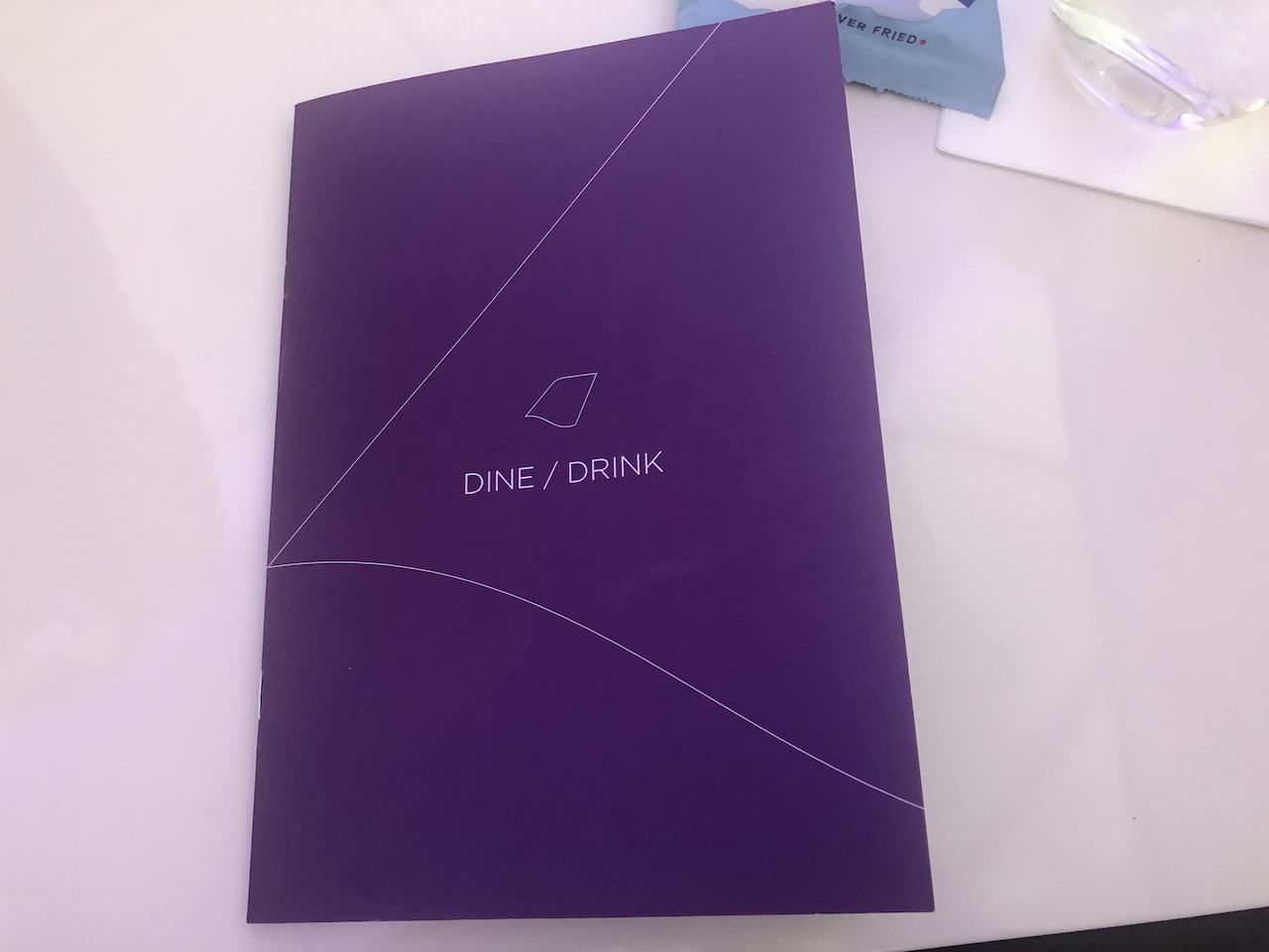 Wir haben gerade das Gepäck verstaut und noch nicht richtig Platz genommen, kam bereits der Champagner zur Begrüßung. Am Sitz waren bereits eine Dose Wasser, das Amenity Kit und eine Speisekarte.