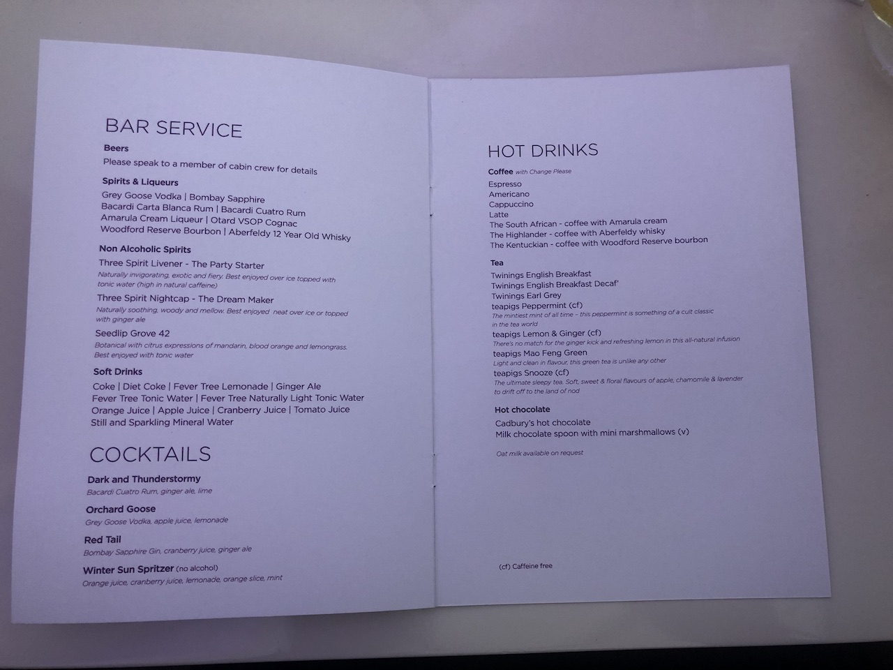 Wir setzten uns langsam in Bewegung und starteten etwas verspätet in Richtung USA. Zeit für die Speisekarte, denn die Vorspeisen und Hauptgänge wurden schon nach wenigen Minuten abgefragt. Parallel kamen zwei Flugbegleiter mit einem Getränkewagen und erfüllten Aperitifwünsche, die Getränke wurden mit Salzgebäck serviert.