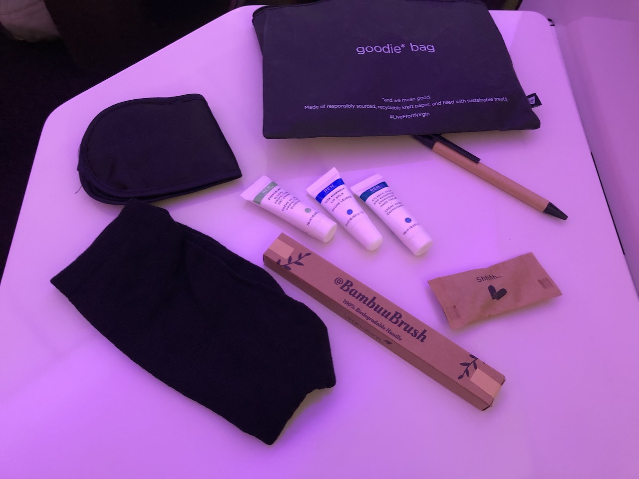 In der ungewöhnlichen Papiertasche waren die üblichen Pflegeprodukte, Maske, Socken und Kugelschreiber.