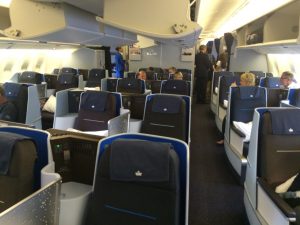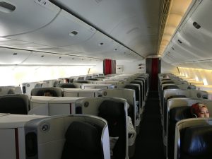 Air France hat mehrere verschiedene Business Class Sitze im Einsatz. Besonders gut ist die Business Class in der Boeing 777 und 787, hier findet man Reverse Herringbone Sitze in einer 1-2-1 Anordnung. Hierdurch hat jeder Passagier direkten Gangzugang und ein komplett flaches Bett. Neue Business Sitze gibts auch im Airbus A330-300, diese lassen sich ebenfalls in ein komplett flaches Bett verstellen, sind allerdings in einer 2-2-2 Anordnung verbaut.