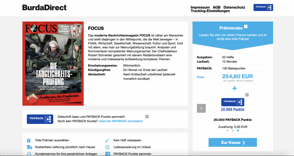 Selten gibt es Payback Abos, mit welchen man mit nur einem Schlag so viele Meilen sammeln kann. Auch wenn es nicht die beste Ratio aller Zeiten ist, ist der Focus durchaus ein lesenswertes Magazin und wenn man selbst oder jemand in eurem Umfeld das Magazin gerne liest, ist dies ein fantastischer Deal.