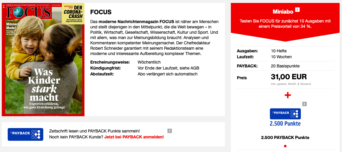 (Ich gehe davon aus, dass nicht das FOCUS-Magazin bzw BamS wichtig ist, sondern nur die Payback-Punkte bzw Meilen.)