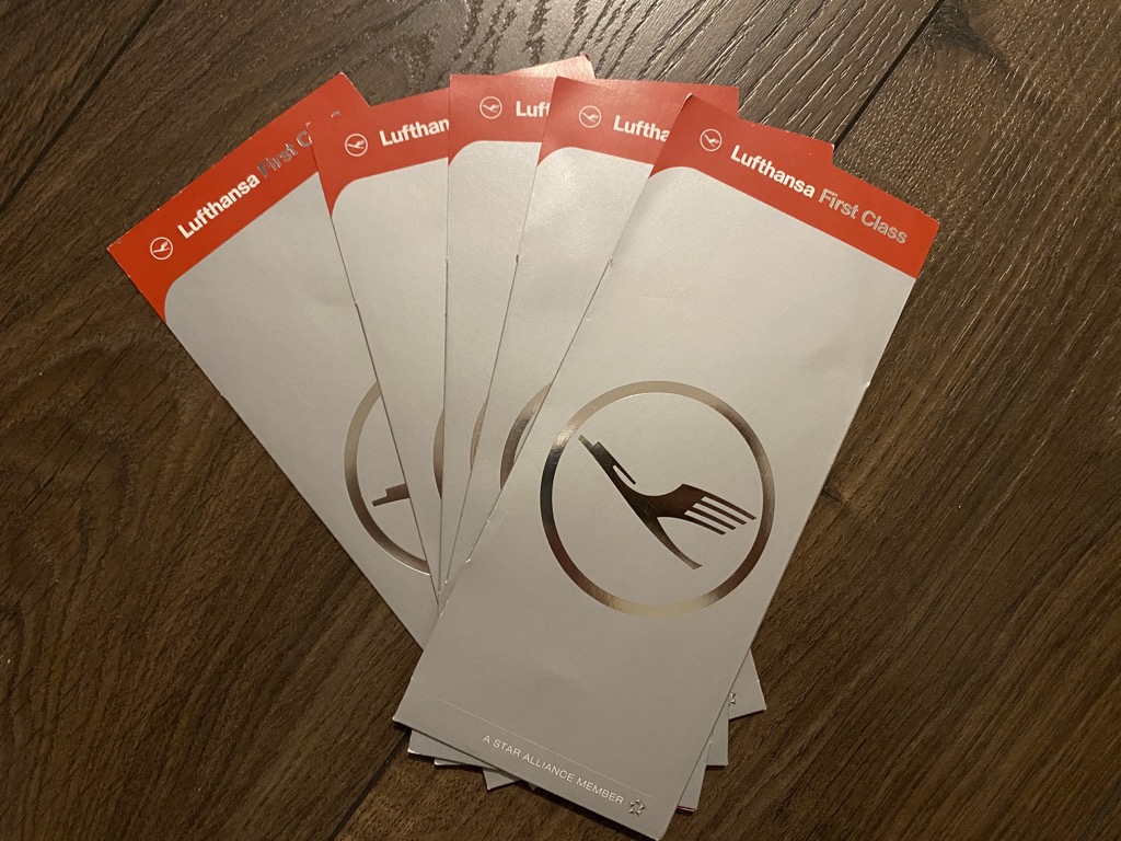 LH First Class Ramona grün (1);LH First Class Rimowa rot (2) je 100€LH First Class Windsor schwarz (3) 35€;Etihad First (4) 35€; LH First Bogner (5) 30€