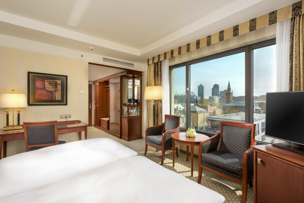 Das Hotel verfügt über 505 elegant eingerichtete Zimmer inklusive 66 Suiten. Neben den üblichen Ausstattungsmerkmalen, wie kostenfreies WLAN, Smart-TV, Klimaanlage, Fön, Zimmersafe in Laptopgröße, Wasserkocher mit Kaffee und Tee, Kosmetikspiegel und Pflegeprodukte im Bad, verfügt das Hotel über Fußbodenheizung – eine angenehme Ergänzung, die man nicht allzu oft in Hotels findet.