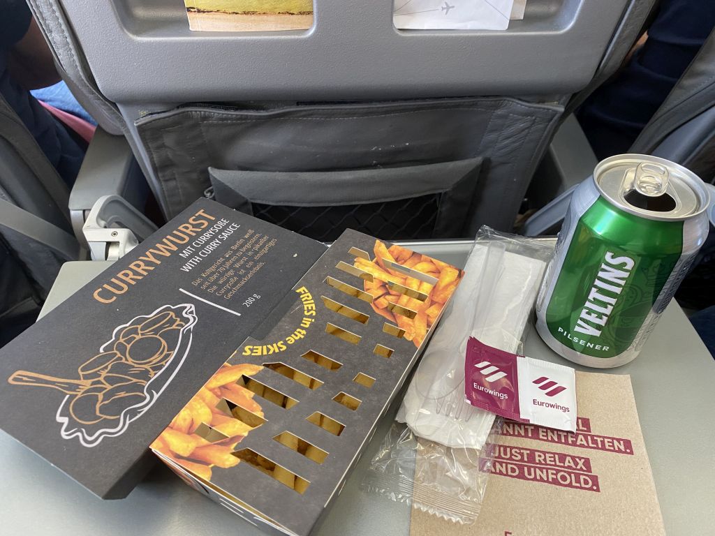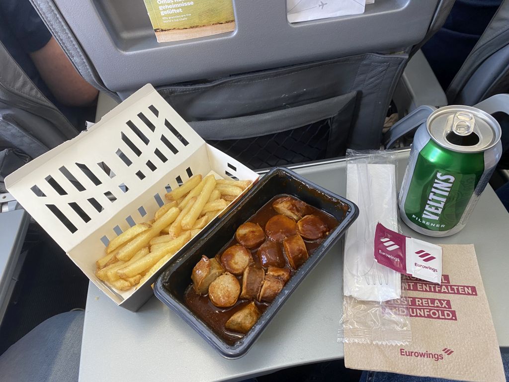 Seit dem Flug quält mich der Gedanke, warum Airberlin das mit der Sansibar Currywurst seiner Zeit noch akzeptabel hingekriegt hat. Die war um Meilen besser als das, was Eurowings da gerade auf die Traytables schmeißt. Und trotzdem haben sich genug Geschmacksverirrte gefunden, dass das Produkt den Weg auf die Speisekarte gefunden hat.