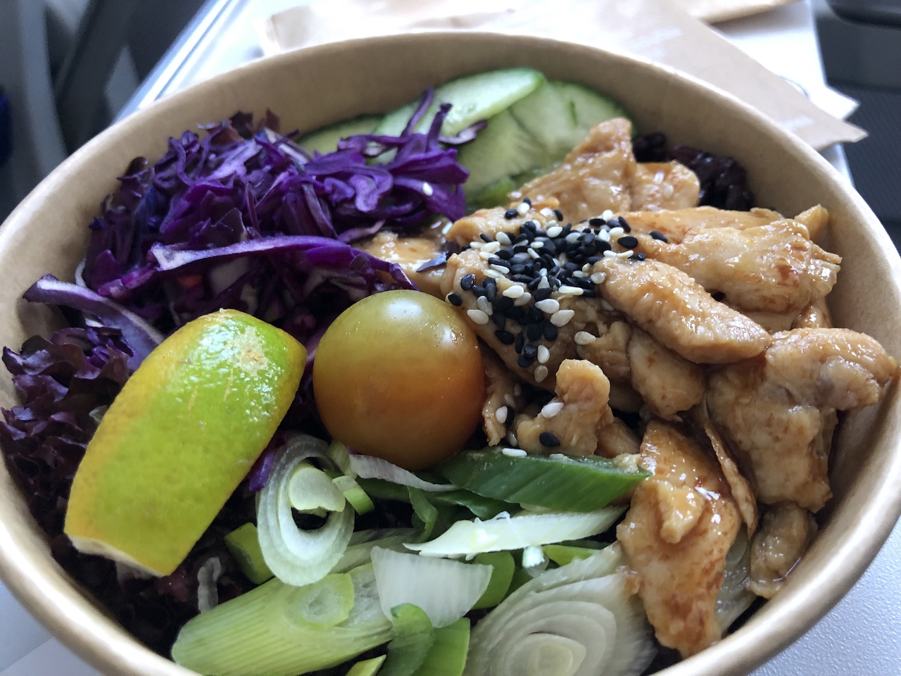 Neben dem bereits erwähnten Falafel Tahini Salat (vegan) gibt es die Teriyaki Chicken Bowl. Die Portion ist etwas kleiner als der Salat und kommt ohne Brötchen. Auch hier war das Gemüse und der Salat knackig und frisch, insgesamt doch etwas trocken. Nur auf Nachfrage habe ich ein Dressing erhalten, scheinbar soll die Bowl ohne Soße serviert werden.