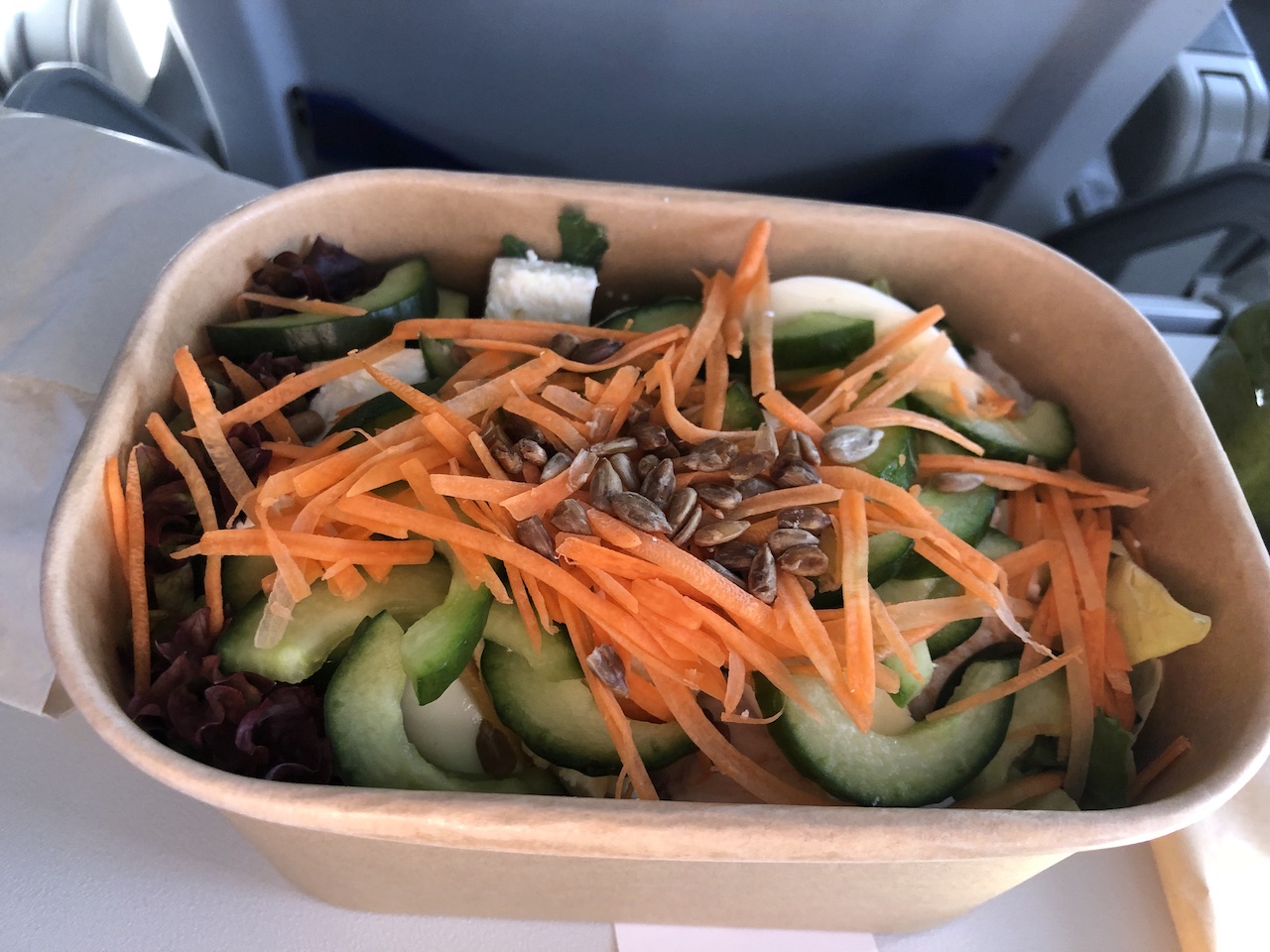 Dem zuvor angebotenen Chicken Ceasar Salad folgt nun ein neuer, frischerer Salat. Das viele knackige Gemüse mit dem leckeren Kräuterdressing ist ein willkommener gesunder Snack an Bord.