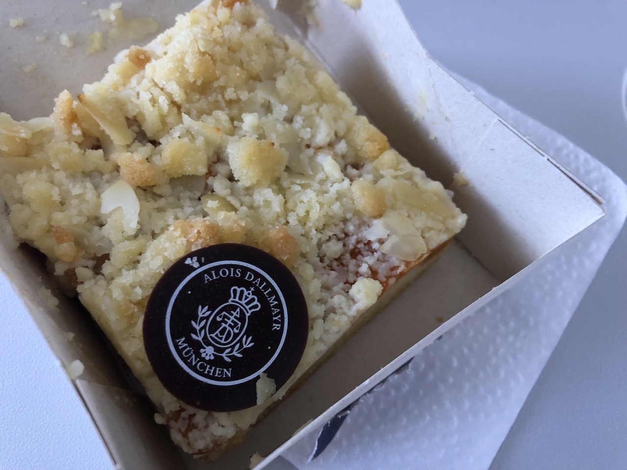 Auch der Kuchen ist geblieben, die Füllung wechselte nun von Apfel auf Aprikose, ansonsten ist dieser mit den Streuseln identisch zum Vorgänger. Für 4€ nicht gerade günstig- im Set mit einem Kaffee, Kakao oder Tee für 6€ zu haben: