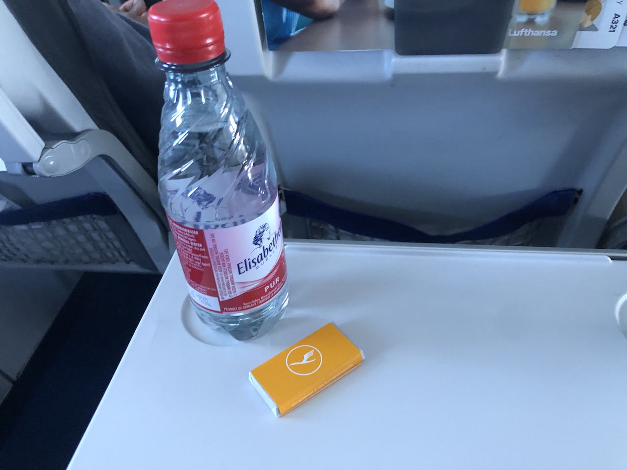 Eine kleine Wasserflasche bleibt allen Passagieren, im Flug wird auch ein kleines Schokoladentäfelchen gereicht. Die neuen Menükarten findet Ihr an Bord oder auch online.