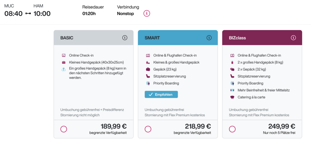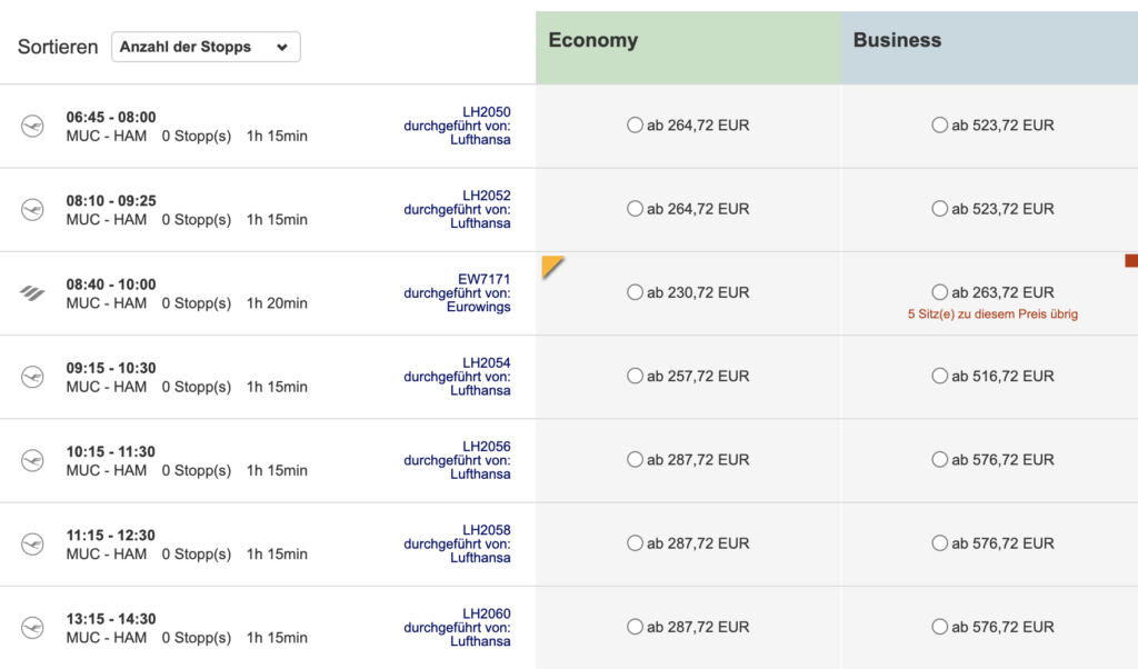 Auf der Seite von Eurowings werden hingegen nur die eigenen Flüge aufgelistet, diese waren zum Zeitpunkt der Abfrage sogar etwas günstiger als beim Kranich. Der Unterschied zwischen Economy und dem BIZClass-Tarif lag bei nur 30€. Bei Eurowings gab es zusätzlich noch den Basic Tarif- hier lag die Differenz zur BIZclass bei 60€.