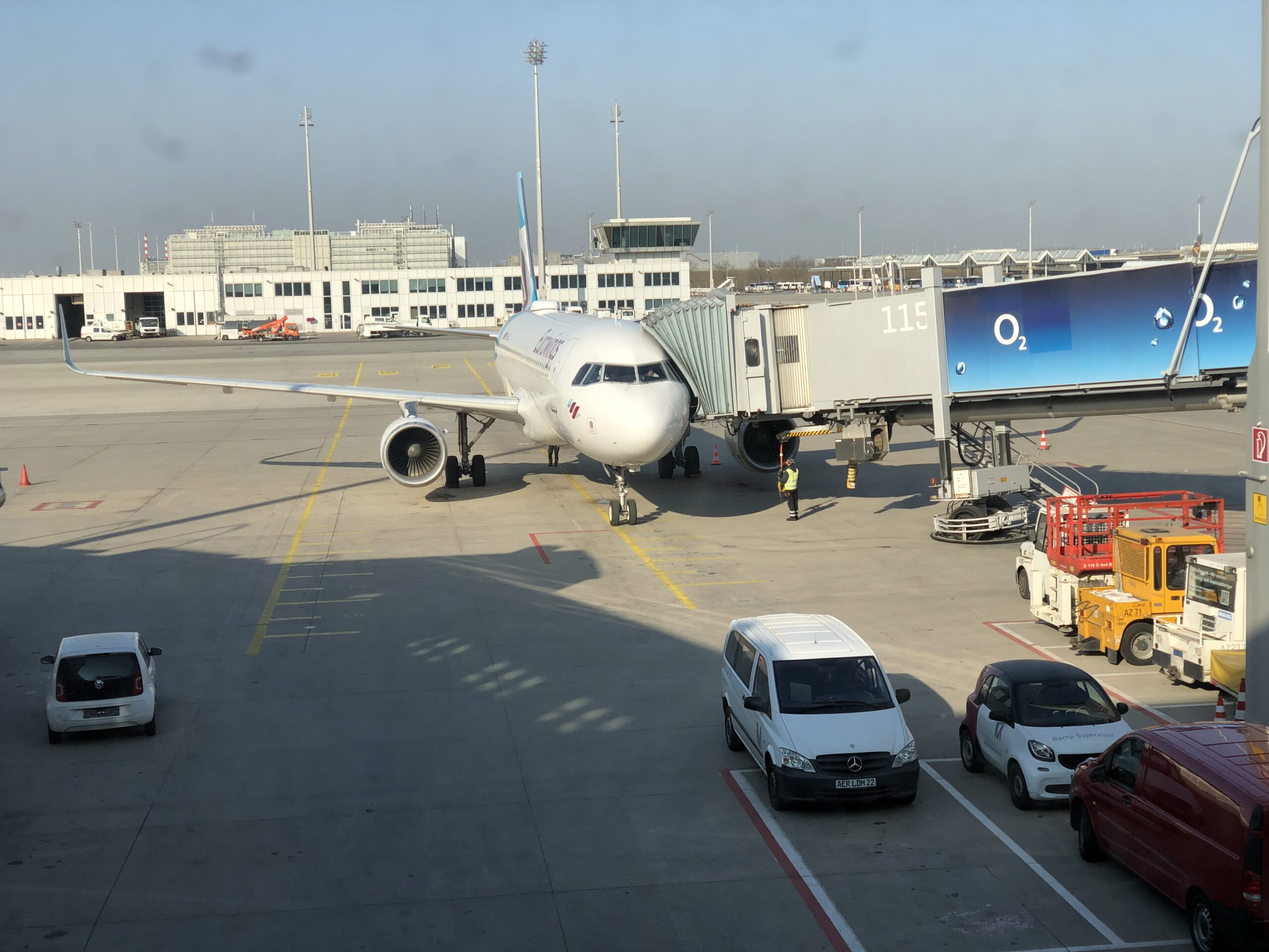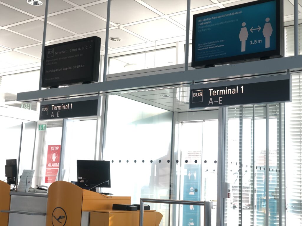 Ich war an diesem Tag nur mit Handgepäck unterwegs und hatte den Flug mit EW separat gebucht. Im Terminal 2 angekommen habe ich online in der App von Eurowings eingecheckt und eine Bordkarte erhalten. Darauf stand dass der Abflug im Bereich D im T1 stattfindet, der Bus hält an mehreren Stationen.