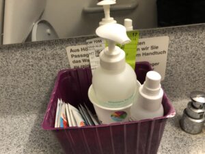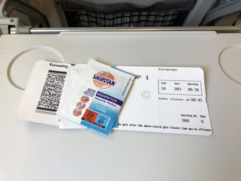 Freundlich wurde ich von einer Flugbegleiterin mit Desinfektionstüchern begrüßt, manche Passagiere erhielten auch eine neue Maske.