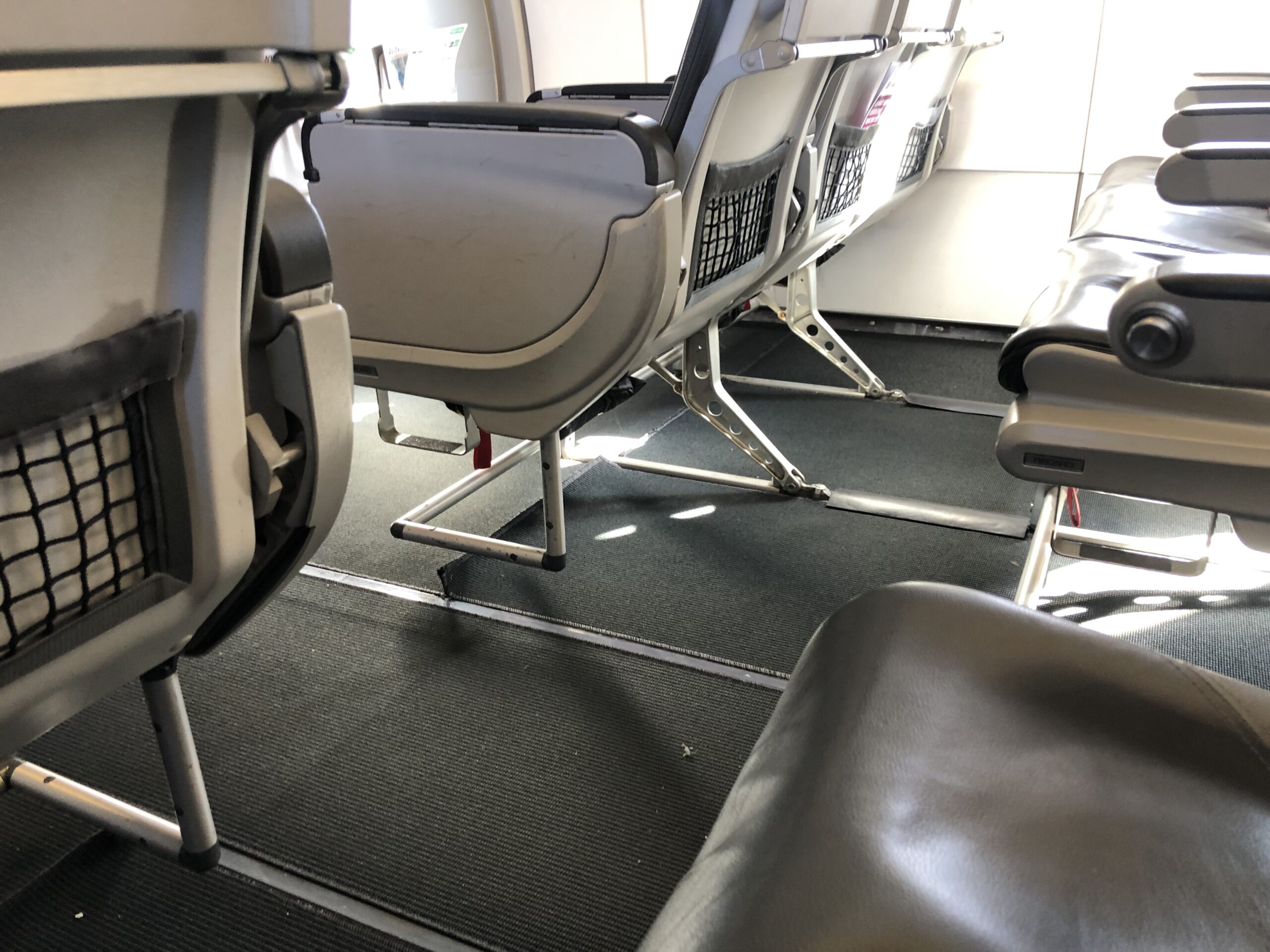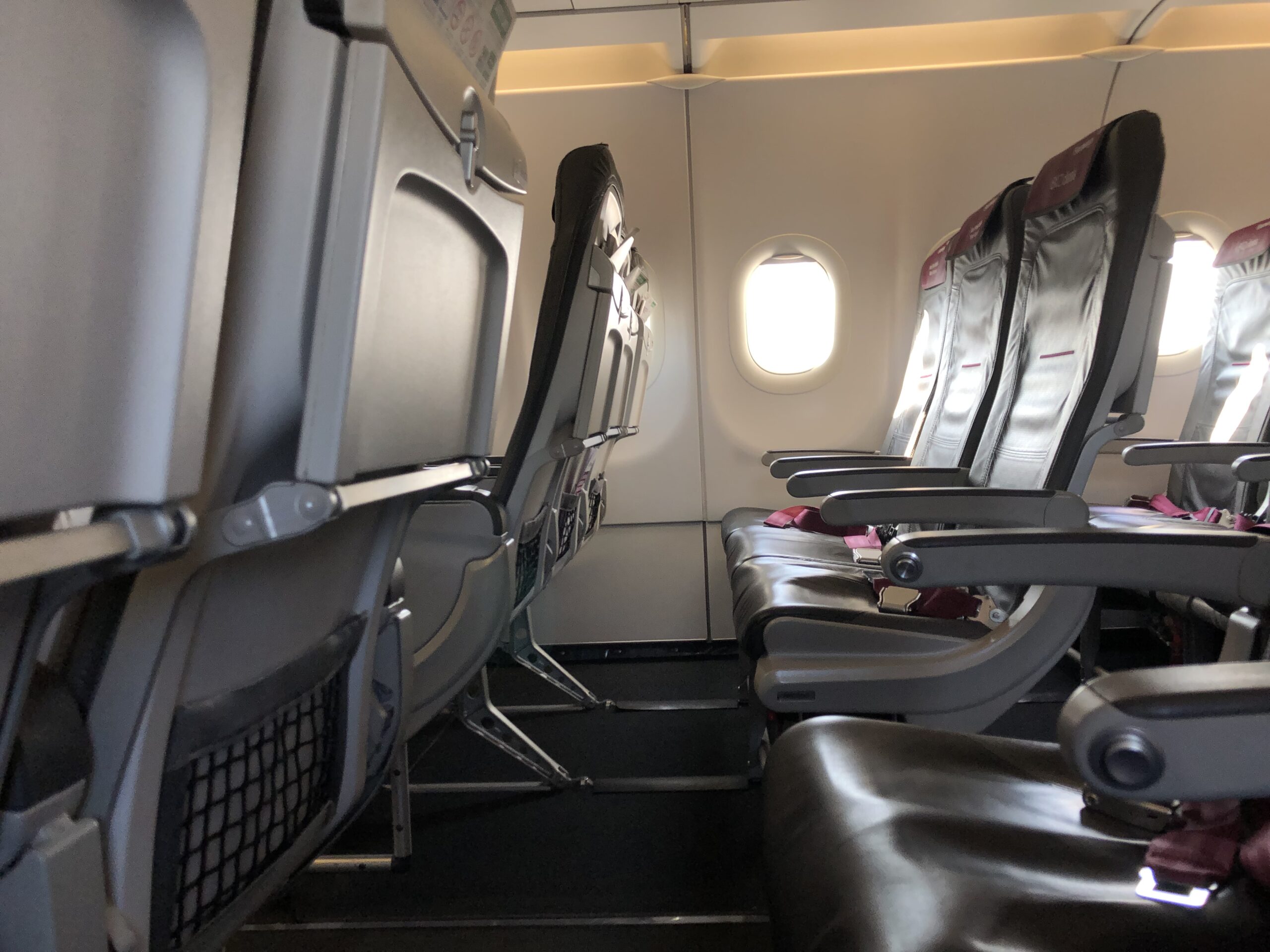Die Beinfreiheit ist in den vorderen Reihen großzügig, neben dem fehlenden Klassenteiler gibt es einen weiteren Unterscheid zu den Lufthansa-Maschinen- die dünne Wand mit Fenster vor der ersten Reihe.