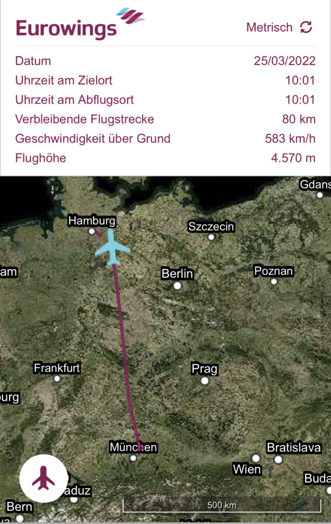 Ein Vorteil von WingsConnect ist die Landkarte mit dem aktuellen Standort und weiteren Flugdaten. Kurz vor Hamburg gab es noch das aktuelle Wetter aus dem Cockpit, die Ankunft sollte zehn Minuten vor der planmäßigen Zeit erfolgen. Die Flugbegleiter haben darum gebeten keinen Abfall zurückzulassen und sind noch einmal durch die Kabine.