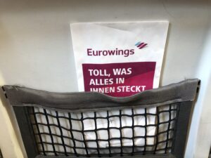 Ungefähr so wie auf dem Bild sieht es auch tatsächlich in der Kabine aus, das Fehlen des Vorhangs fand ich etwas ungewohnt. Die Maschine füllte sich, bei Boarding completed war ich der Einzige in der ersten drei Reihen, danach waren die Sitze bis zum Notausgang voll besetzt. Hier ein Eindruck aus einem Beitrag von Sebastian, der einen Eurowings-Flug am Notausgang gereviewt hat.