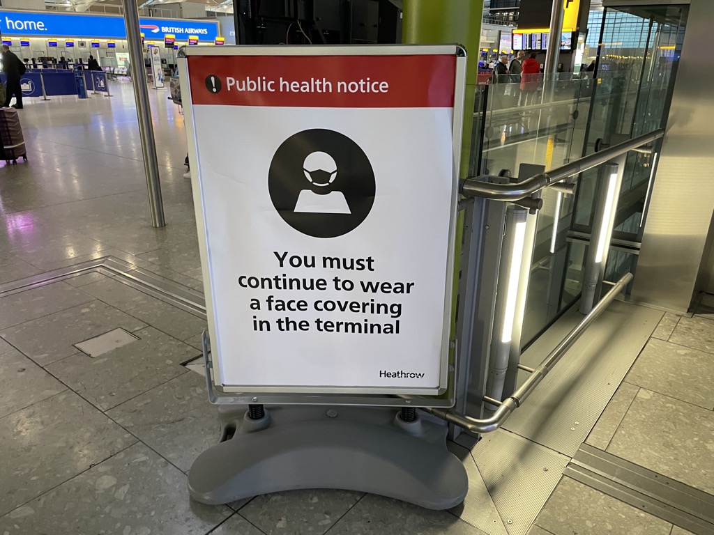 Am Flughafen in London Heathrow wurde vor meinem Abflug zwar noch auf großen Schildern auf die Maskenpflicht am Flughafen hingewiesen, diese sollen aber nun abgebaut werden, wie man mir schon beim Betreten des Airports sagte, als ich es fotografiert habe.