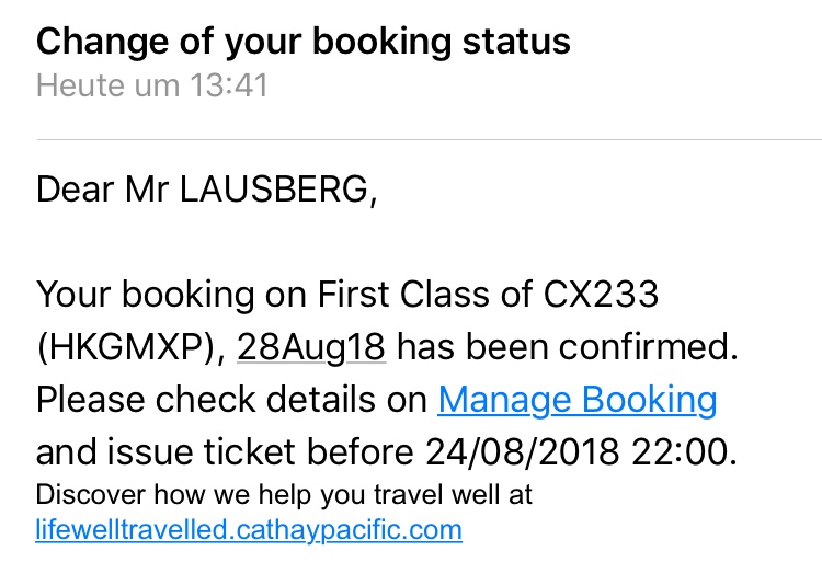 Eigentlich habe ich auf zwei Cathay Pacific First Class Prämienflüge von Hongkong nach Europa spekuliert. Wer Cathay Pacific mit ihren nur sechs First Class Sitzen kennt, der weiß, dass zwei Awards auf einem Flug recht selten sind, zumindest lange im Voraus. Daher habe ich auf allen für uns in Fragemkommenden Flügen nach Europa zwei Plätze in der First Class über das Meilenprogramm von Cathay Pacific, Asia Miles, auf Warteliste angefragt.