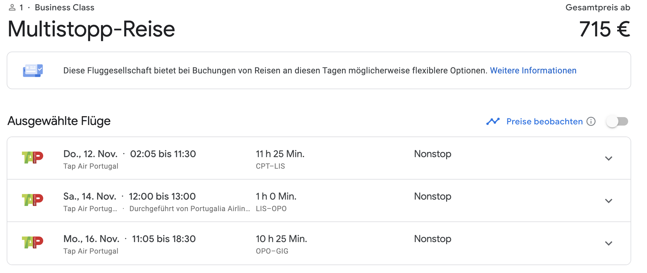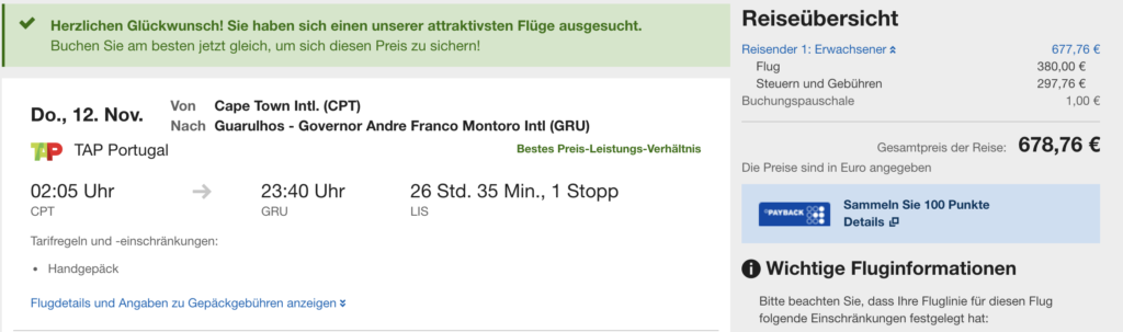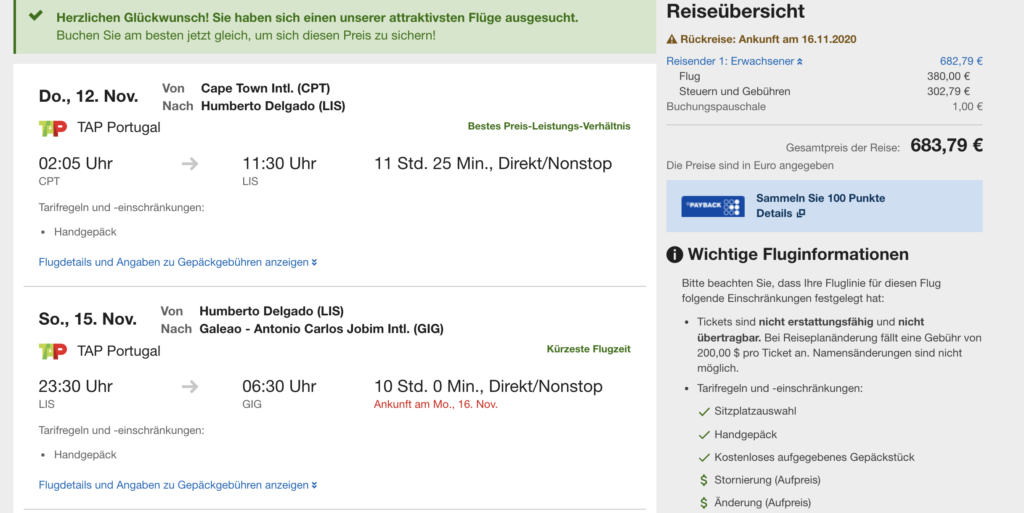 Willkommen im Club. Habe ebenfalls gestern gebucht. CPT-LIS-GRU Ende November.Etwas teuerer 810€ aber kann dafür kostenlos stornieren und voller Refund ohne Nebenkosten.Habe auch 1 Tag in LIS und werde ebenfalls über Prämienflüge Hin und Rückreise bestreiten. Kleines Schmankerl noch am Rande : Wer Lust und Zeit hat der kann bei TAP auch ab SFO nach LHR,LGW für 90€ OW in ECO fliegen. Termine bis Feb.21. ORY für 110€ und BCN für 105€.Ab NOV 20 ist auch Cancun im Flugplan.Vieleicht gibt es auch mal was in diese Richtung. Eins noch , soweit ich weiß hat TAP die alten A330 ausgemustert, sprich nur noch die neuen in Betrieb.