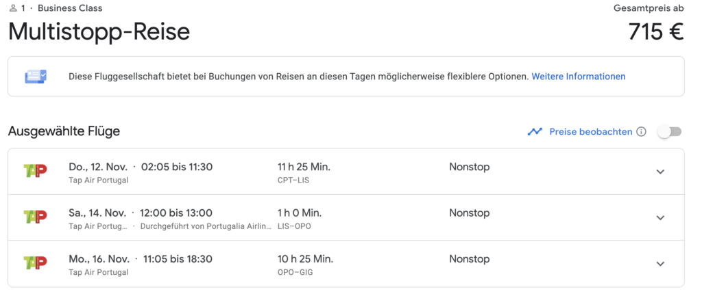 Nimmt man noch Anschlussflüge dazu, kann der Preis sogar günstiger werden. Für 739€ erhält man noch die Weiterreise nach Deutschland, ebenfalls in Business Class. Diese Übersicht findet Ihr am besten bei Google Flights.