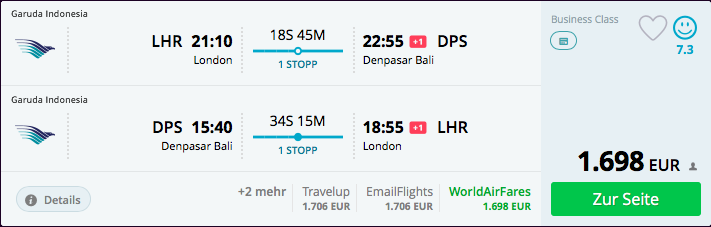 Da ist es einfach nur fantastisch, dass Garuda Indonesia tolle Angebote ab London nach Bali aufgelegt hat. Neben dem wahnsinnigen Angebot von 2.600 Euro für Hin- und Rückflug in der First Class, könnt Ihr auch für sehr günstige 1.698 Euro in der Business Class komfortabel auf die paradiesische Urlaubsinsel Bali fliegen.