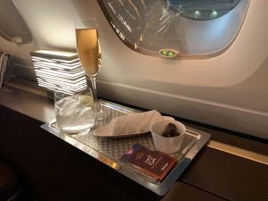 Das angesprochene cost cutting von EY liegt weiter als Januar zurück, ich meine die Zeiten vor Juli 2017. Die Qualität der Speisen und Getränke in der Lounge in LHR wurde nach unten korrigiert (die Lounge dort war schon immer „ein Loch im Keller“, aber das Angebot war zumindest besser). Das gleiche gilt onboard: beim Essen & Trinken wurde eingespart: billig(st)e Weine, Champagner statt Bollinger La Grande Année „nur“ noch 2006er Charles Heidsieck (deren NV bei SQ in der Business serviert wird und dafür ein exzellentes Produkt ist), das amenity kit ist billig und Aqua di Parma gebranded – nicht wie früher ein hochwertiges Eigenprodukt im arabischen Stil. Billig(er) trifft auch auf den Pyjama zu und statt Free wifi gibts lediglich 90 MB – schlechter macht das nur noch LX mit 50 MB in der First….