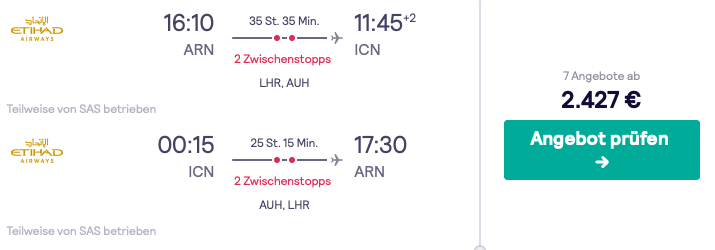 Direkt bei Etihad, als Gabelflug RN-AUH, AUH-ICN, ICN-AUH, AUH-ARN blitzt im Browser nur kurz eine Nicht-Verfügbar-Seite auf, dann komme ich zurück zur Flugsuche…