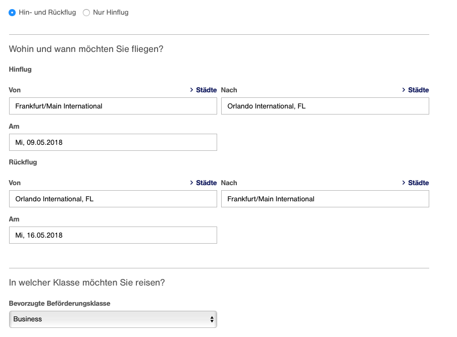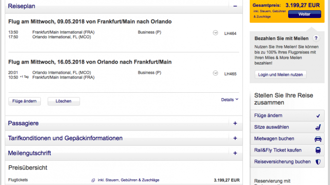 Natürlich sind 950 Euro immer noch viel Geld, allerdings ist dies eine enorme Ersparnis im Vergleich zu einem regulären Business Class Ticket. Ich werde in diesem Beispiel einen Flug in der Lufthansa Business Class von Frankfurt nach Orlando verwenden. Regulär kostet der günstigste Tarif in der Lufthansa Business Class auf dieser Strecke aktuell 3.199,27 Euro. Ihr seht, mit der richtigen Strategie, könnt Ihr jede Menge Geld in der Premium Klasse sparen.