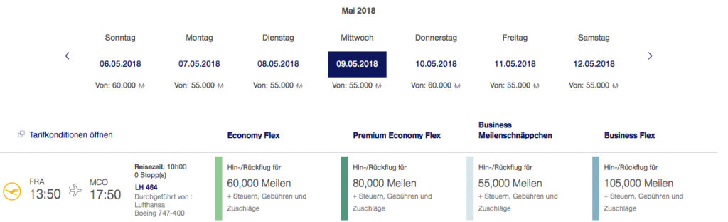 Wie ich ja bereits eingangs geschrieben habe, können wir durch die Lufthansa Meilenschnäppchen diesen Flug auch für 55.000 Miles&More Meilen buchen. Bitte beachtet, dass Meilenschnäppchen jeden Monat neu veröffentlicht werden und der Reisezeitraum und die Ziele begrenzt sind. Man findet aber fast jeden Monat spannende Destinationen in Nordamerika, Asien und dem Mittleren Osten.